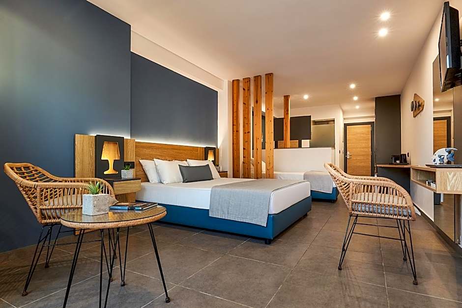 This deluxe suite overlooks the Cretan Sea and offers panoramic sunset views from the balcony. Each room comes with a queen-size bed, stylish white-blue décor, large windows and elegant furnishings. Each room includes a flat-screen TV, a safe box, a mini-bar, a coffee machine and a private bathroom.